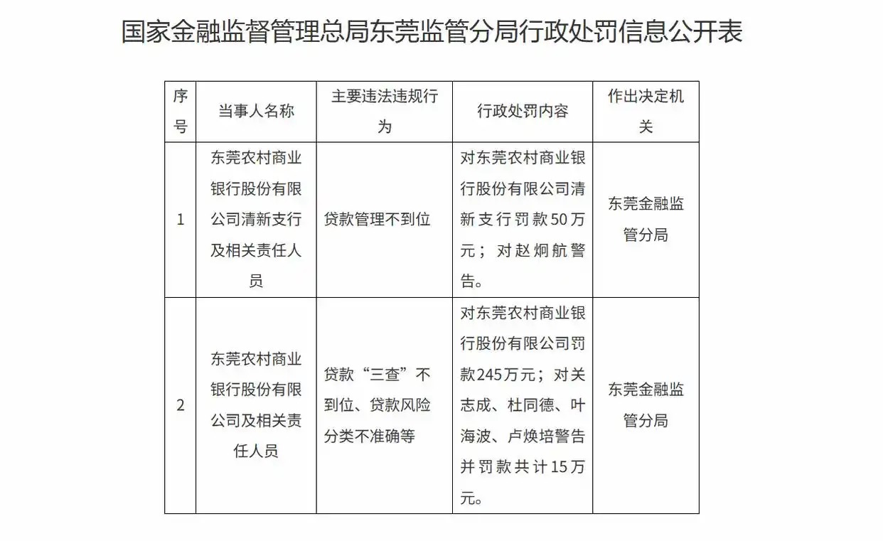 合规方面,2025年11月,国度金融监督措置总局广东监管局发布的公告涌现,东莞农商银行因贷款“三查”不到位、贷款风险分类不准确等被罚金245万元,遭殃东说念主关志成、杜同德、叶海波、卢焕培被劝诫并罚金规划15万元。与此同期,东莞农商银行崭新支行因贷款措置不到位被罚金50万元,遭殃东说念主赵炯航被劝诫。