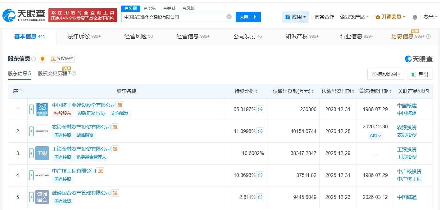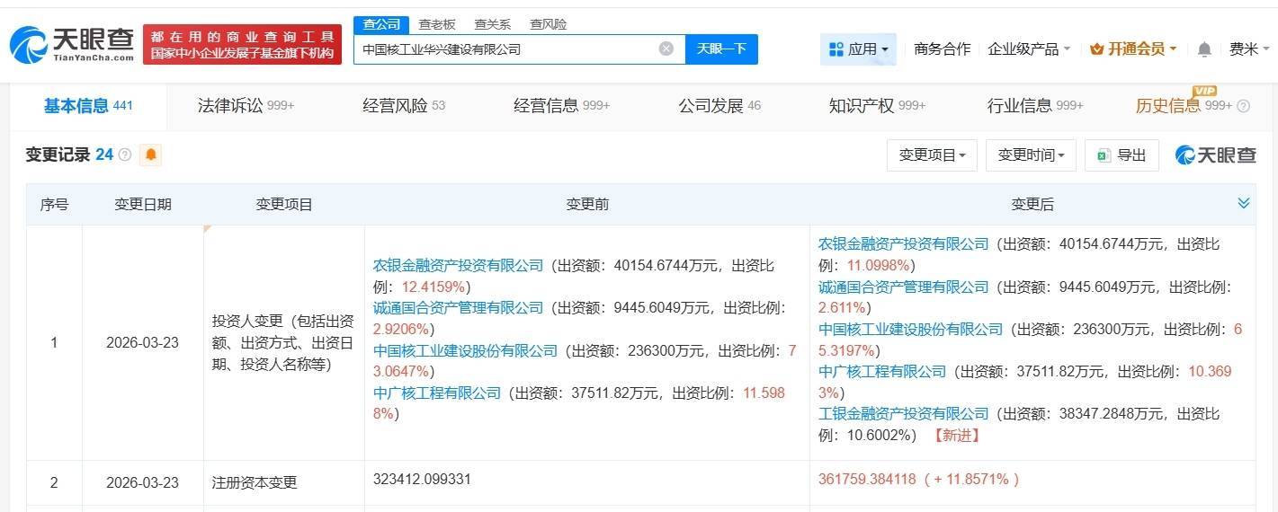 南边财经3月25日电,天眼查App知道,近日连云港股票配资门户综合平台_配资资讯学习与行情说明,中国核工业华兴树立有限公司发生工商变更,新增工银金融财富投资有限公司为鼓吹,同期,注册老本由约32.3亿东谈主民币增至约36.2亿东谈主民币,增幅约12%。该公司成立于1986年7月,法定代表东谈主为周博,臆测领域包括树立工程施工、树立工程策画、树立工程监理等,现由中国核建(601611)、农银金融财富投资有限公司、中广核工程有限公司及上述新增鼓吹等共同抓股。